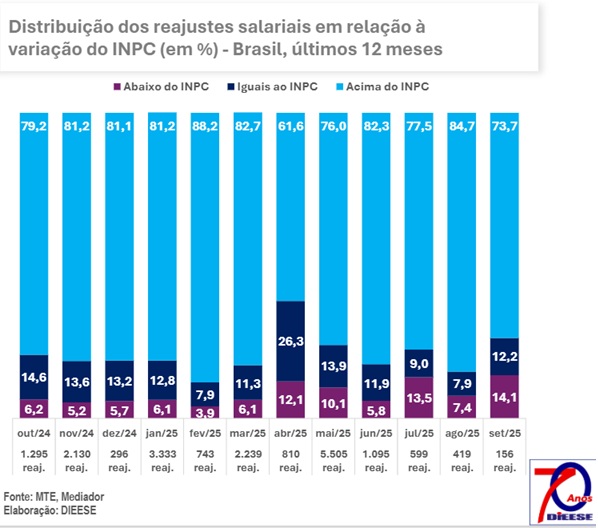 Os resultados do mês passado, até agora, consideram 156 negociações coletivas registradas até 6 de outubro. Além dos 73,7% com ganho real e dos 14,1% abaixo da inflação, outros 12,2% dos casos recompuseram o INPC.