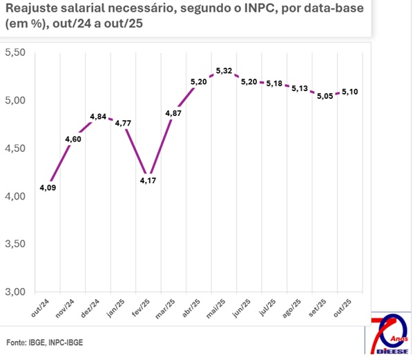 É indicado que o valor do reajuste salarial necessário para as categorias com data-base em setembro foi de 5,05% do INPC. Em outubro deverá aumentar para 5,1%. A leve variação e a sequência mensal demonstram que o cenário é de estabilidade no índice.